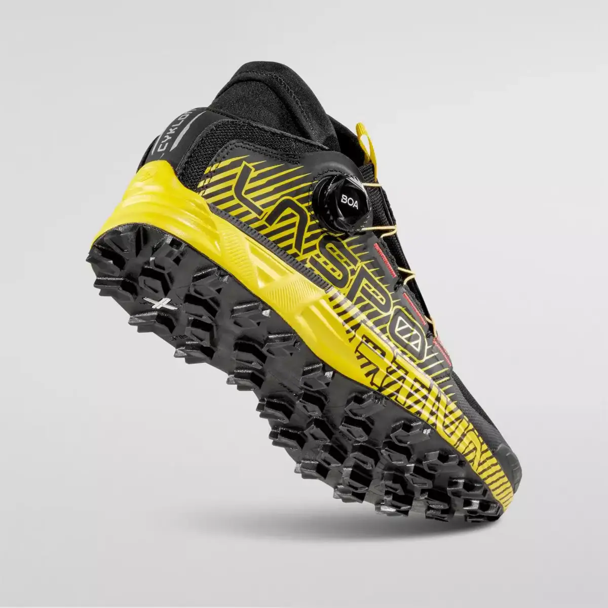 Cyclon ist der Performance-Schuh für Skyraces und Offroad-Rennen auf technischem Terrain über mittlere Distanzen. Er ist das Ergebnis der Forschungs- und Entwicklungsarbeit von La Sportiva und BOA® und garantiert dank des neuen Dynamic Cage™ mit BOA® Fit System, das in Synergie mit drei verschiedenen Elementen des Obermaterials für perfekten Halt und Stabilität des Fußes sorgt, Stabilität, Präzision und eine perfekte Passform für sichere und präzise Abfahrten. Das Herzstück des Schnürsystems ist die interne Dynamic Flap™, die den Fuß umschließt und über das BOA® Fit System mit einer mühelosen Handbewegung sofort und präzise aktiviert wird. Die schützende TPU-Zehenkappe und die mehrlagige, thermoadhäsive Seitenwand bieten zusätzliche Struktur und Aufprallschutz. Die Mud-Ground-Laufsohle, ideal für weichen und schlammigen Untergrund, besteht aus der extrem griffigen La Sportiva FriXion™ White-Mischung und bietet die Möglichkeit, AT Grip Spike-Spikes für den Einsatz auf eisigem Untergrund zu integrieren. Die EVA-Zwischensohle mit doppelter Dichte und Stabilisierungseinsatz trägt zur Gesamtstabilität des Schuhs bei und hält das Gewicht gering. Cyklon: Schweben Sie wie ein Schmetterling, laufen Sie wie der Wind.